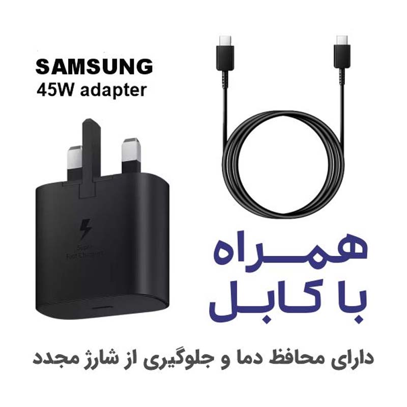 شارژر دیواری 45 وات سامسونگ مدل اصلی با اتصال به پریز سه پین و تکنولوژی شارژ سریع USB PD 3.0، دارای درگاه خروجی USB Type-C، به همراه کابل USB Type-C به طول 180 سانتی‌متر