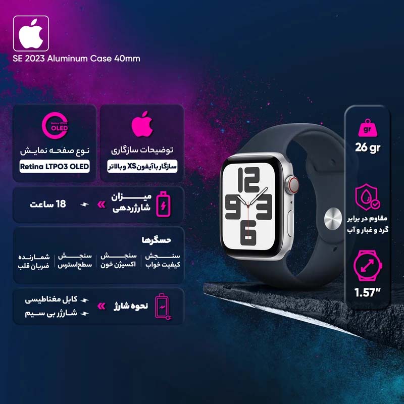 ساعت هوشمند اپل واچ سری SE مدل 40mm Aluminum Case از ساعتهای هوشمند زیبای این برند است.این اپلواچ 40 میلیمتری ویژگیهای خاصی دارد که میتوان از میان آنها به مقاومت در برابر آب تا عمق 50 متری اشاره کرد. مقاومت در برابر آب این مدل موجب میشود، کاربر هنگام بارش باران یا شستوشوی دست، بدون نگرانی از این گجت استفاده کند، همچنین قادر به استفاده از آن برای برخی ورزشهای آبی (نظیر شنا در آبهای کمعمق و کوتاهمدت) باشد..اپل واچ سری SE از تراشه S5 بهره میبرد که بنابر گفتههای کارشناسان اپل تا 2 برابر سرعت بیشتری نسبت به اپل واچ سری 3 خواهد داشت. سیستم مسیریابی جیپیاس داخلی از قابلیتهای جذاب این مدل از سری جدید اپلواچ هستند.
